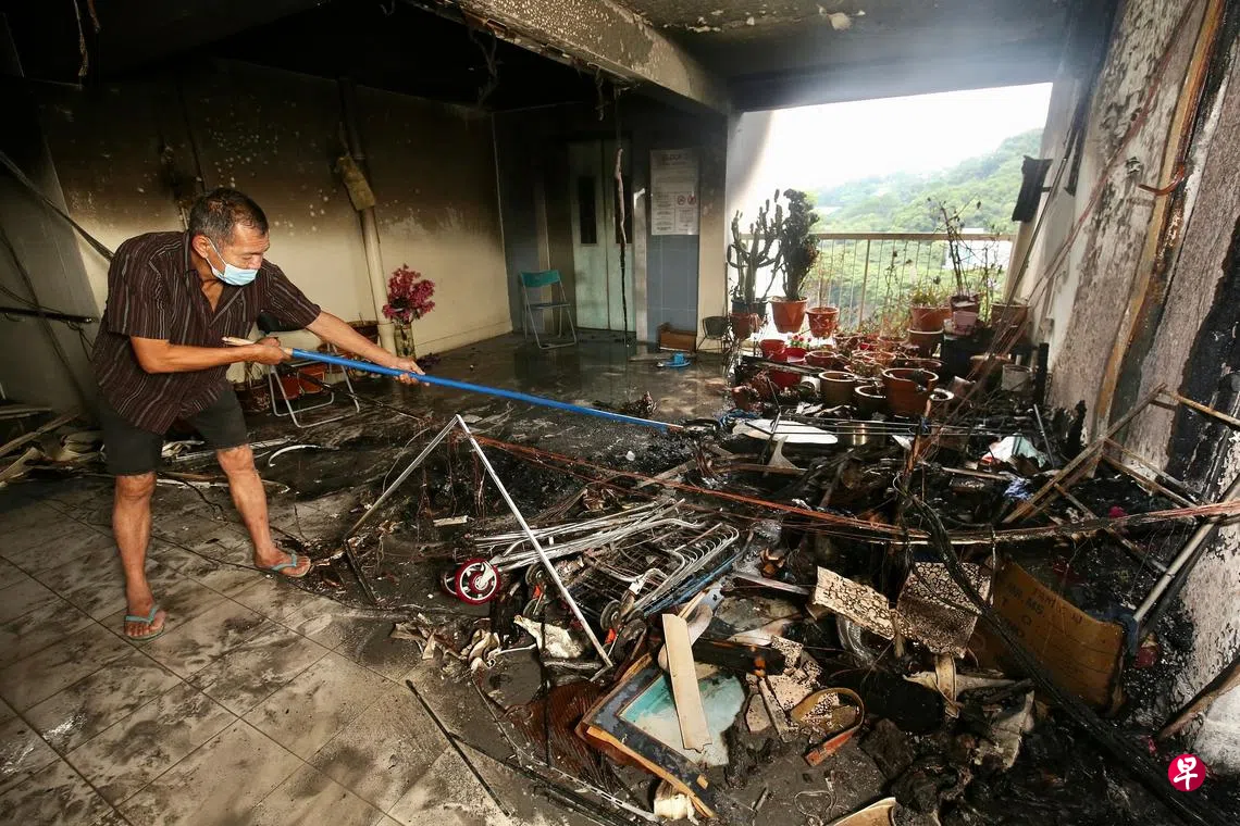 居民曾德福(图中)告诉记者,当晚闻到烧焦味后出门查看,发现电梯间的杂物起火烧了起来。他先是尝试用一块布灭火,随后又用木棍将还未着火的杂物拨开,但火势蔓延得太快,最终整堆杂物都在火舌中。
