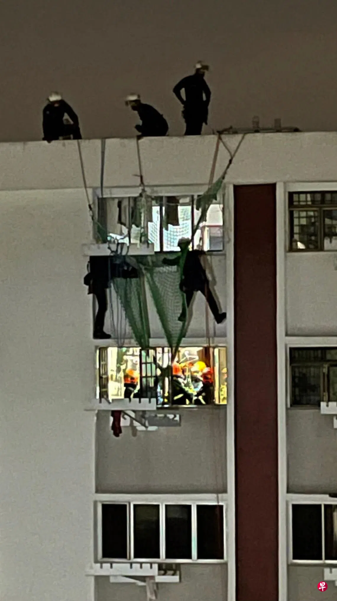 他说,昨天民防部队人员敲门,说楼上有人把自己反锁屋内,需要从他家的厨房窗户撒网救人时,他才知道妇女出事了。