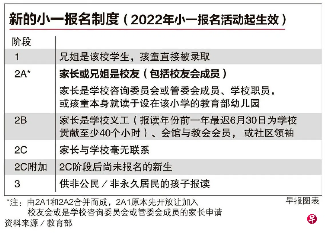 由于近年有越来越多孩童无法报读靠近住家的小学,教育部明年起修订小一报名制度,将2C阶段预留的学额增加一倍至40个,让更多与学校没有直接联系的学生得以在住家附近求学。