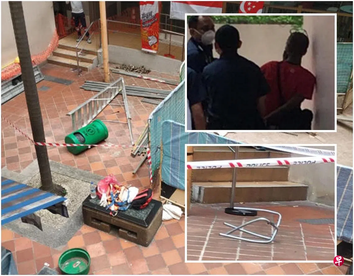 星期天(9月12日)一早发酒疯,中年汉手拿酒瓶大闹熟食中心,大声嚷嚷要找人,等了半天却不见人,他被负责安全登录(Safe Entry)女职员劝阻,却又转身搭电梯上楼,并被指从楼上丢下椅子和垃圾桶,吓得路人纷纷躲避!