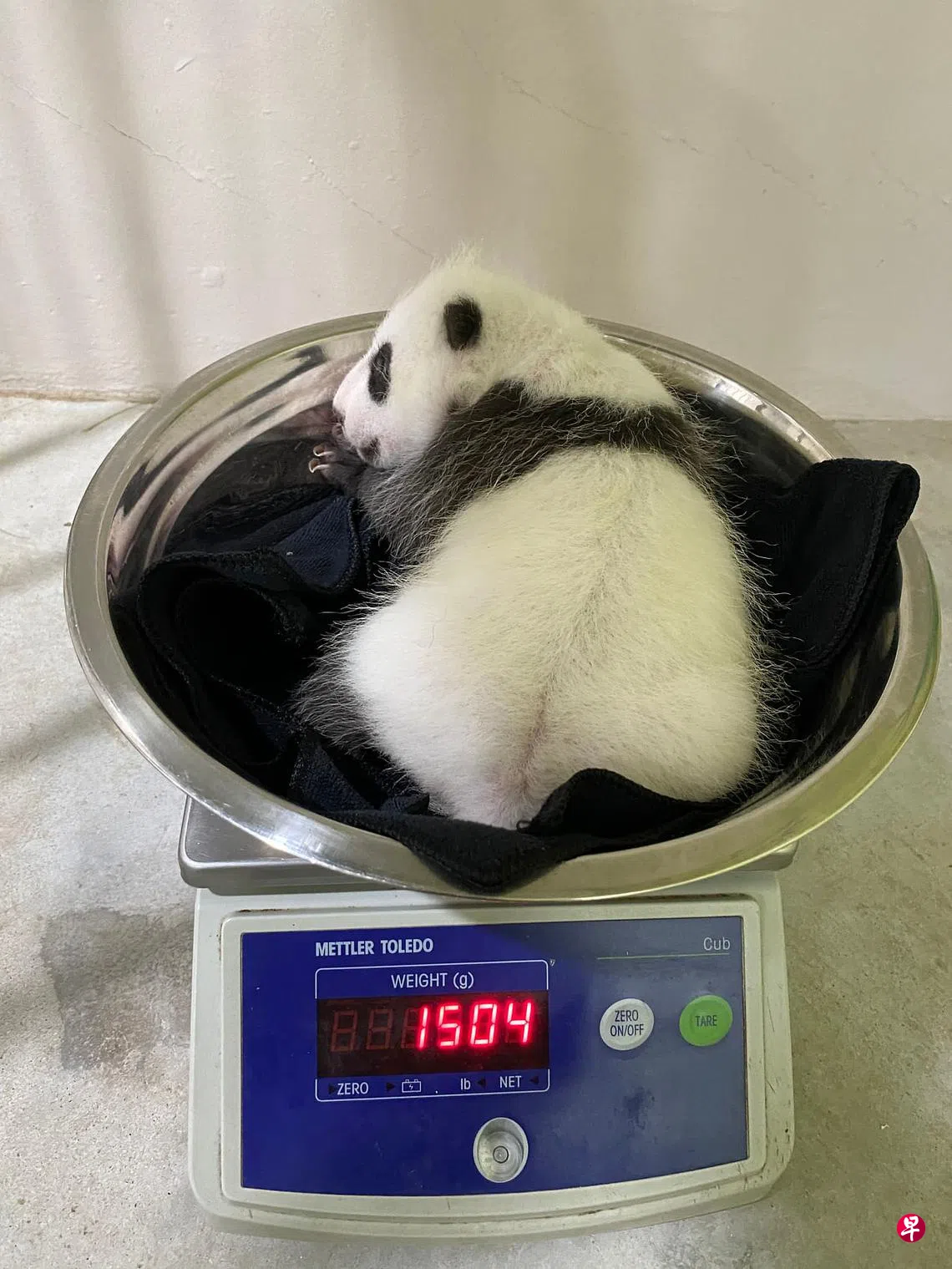根据新加坡野生动物保育集团的文告,熊猫保育团队昨早趁着大熊猫妈妈嘉嘉在河川生态园的产房吃早餐时,第一次给一个月大的幼崽称重。