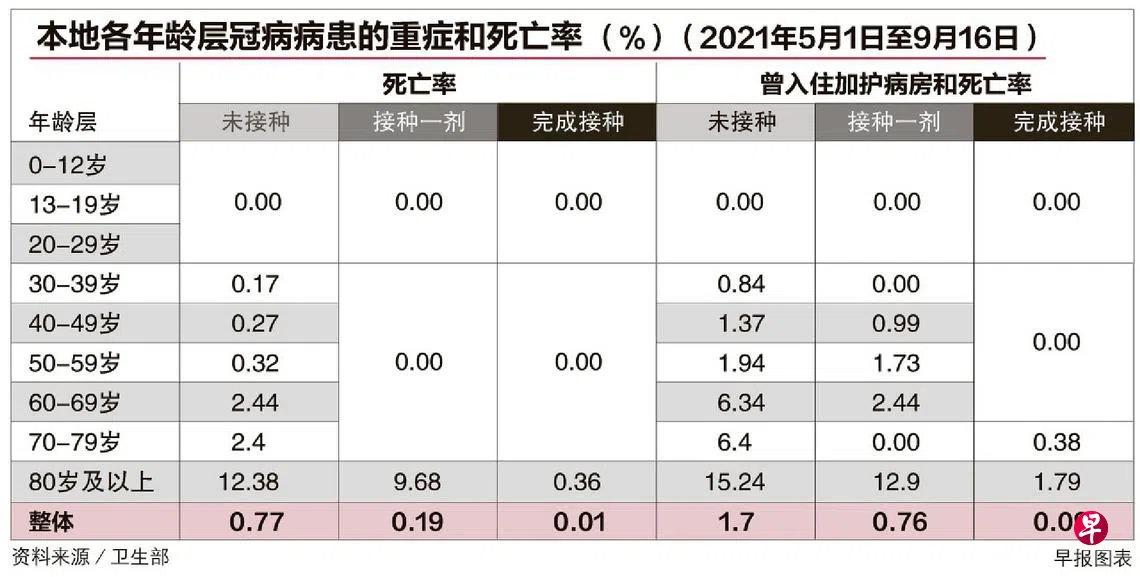 在已完成接种的80岁及以上病患中,每100人的重症与死亡率为1.79。相比之下,未接种疫苗的50岁至59岁病患的重症与死亡率则为1.94。
