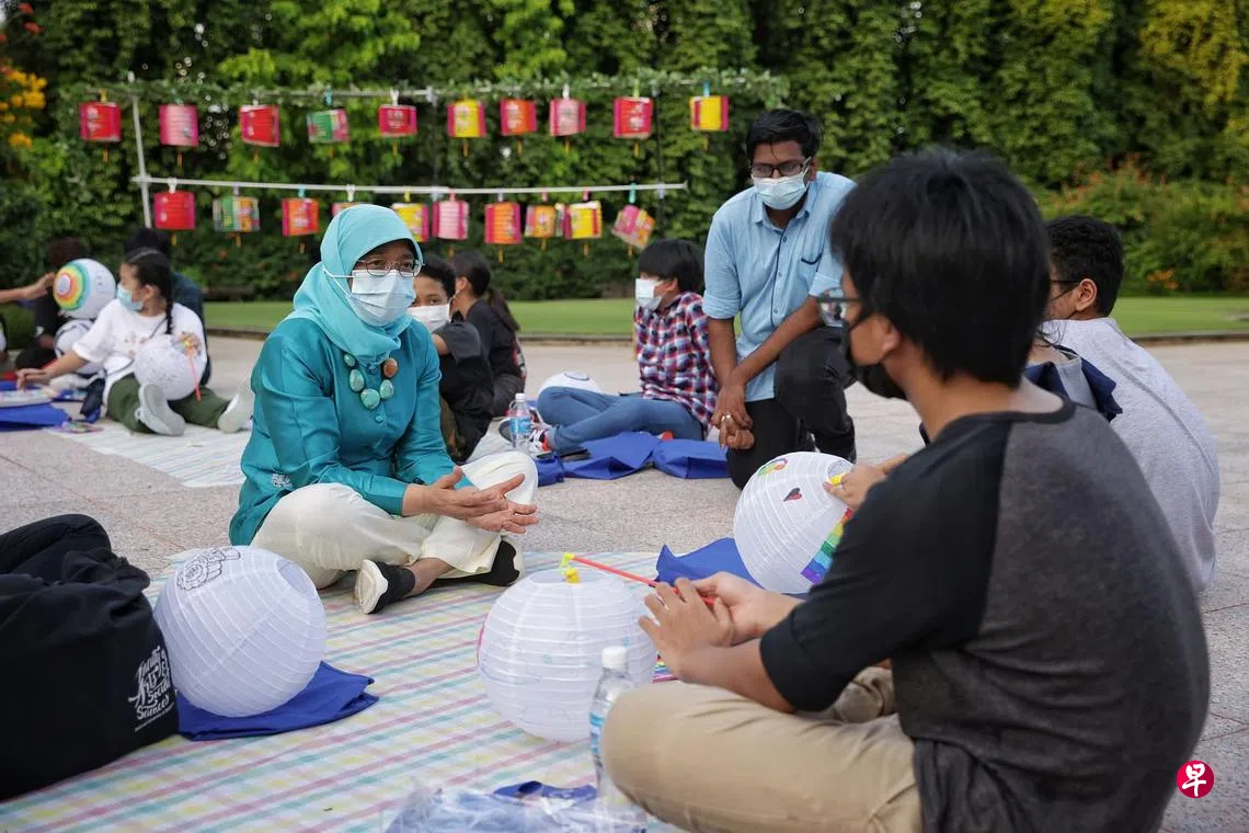 受邀游园的是数名来自金文泰辅导计划的中小学生与志愿者,他们在总统府庭院内席地而坐,自己动手绘制灯笼。哈莉玛总统也到场与同学生们互动交流。