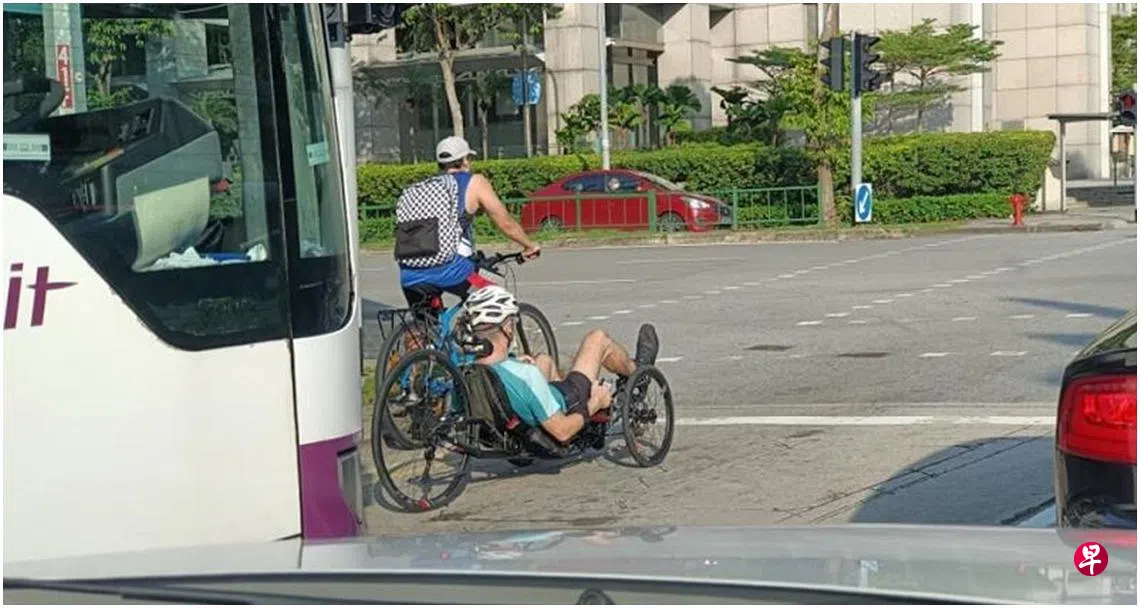 车水马龙的路中央,一名男子骑着斜躺式三轮脚踏车,停在一辆巴士前,悠闲地“躺”着等交通灯。这突兀的一幕被公众拍下并上载到社交媒体,引起网民的关注和热议。