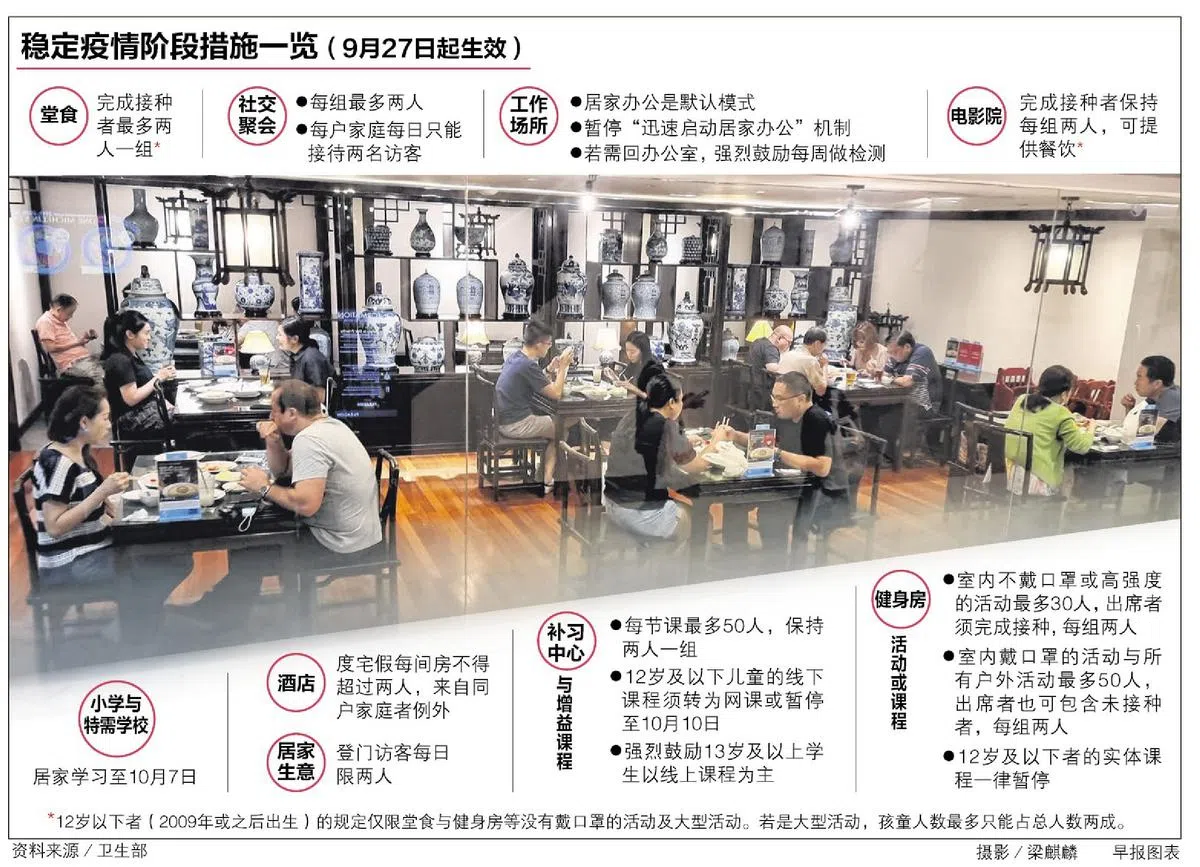 我国将进入近一个月的稳定疫情阶段,为了减缓冠病在社区传播的速度,安全管理措施下周一(9月27日)起收紧,其中包括将社交聚会与餐馆堂食的人数上限从五人减少至两人。