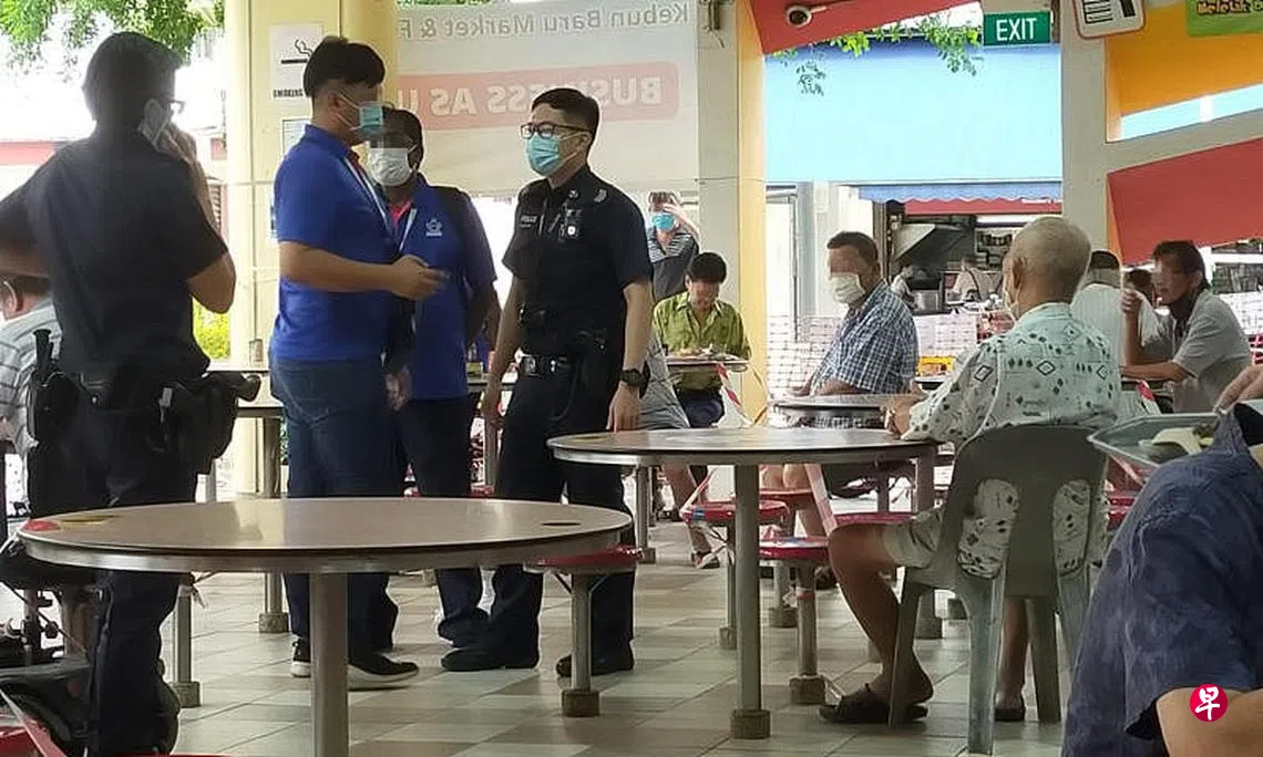 记者到场后,一名在不远处负责Safe Entry的工作人员徐雪绿(30岁)表示,老伯与另一名友人坐在靠背塑料椅上,身着制服的环境局人员上前规劝,希望二人移坐,以确保安全距离,结果友人随即离开,但老伯却无动于衷。