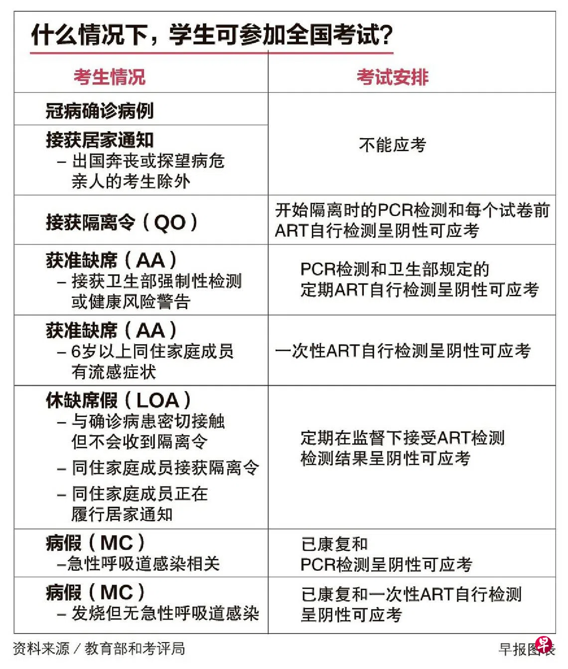 和往年一样,因冠病相关原因或或病假、丧事等缘由无法参加全国考试的学生,当局不会安排缺席者补考,但考生可以申请特殊考量。新加坡考试与评鉴局会根据多个来源的数据来评定考生的成绩,以确保公平。