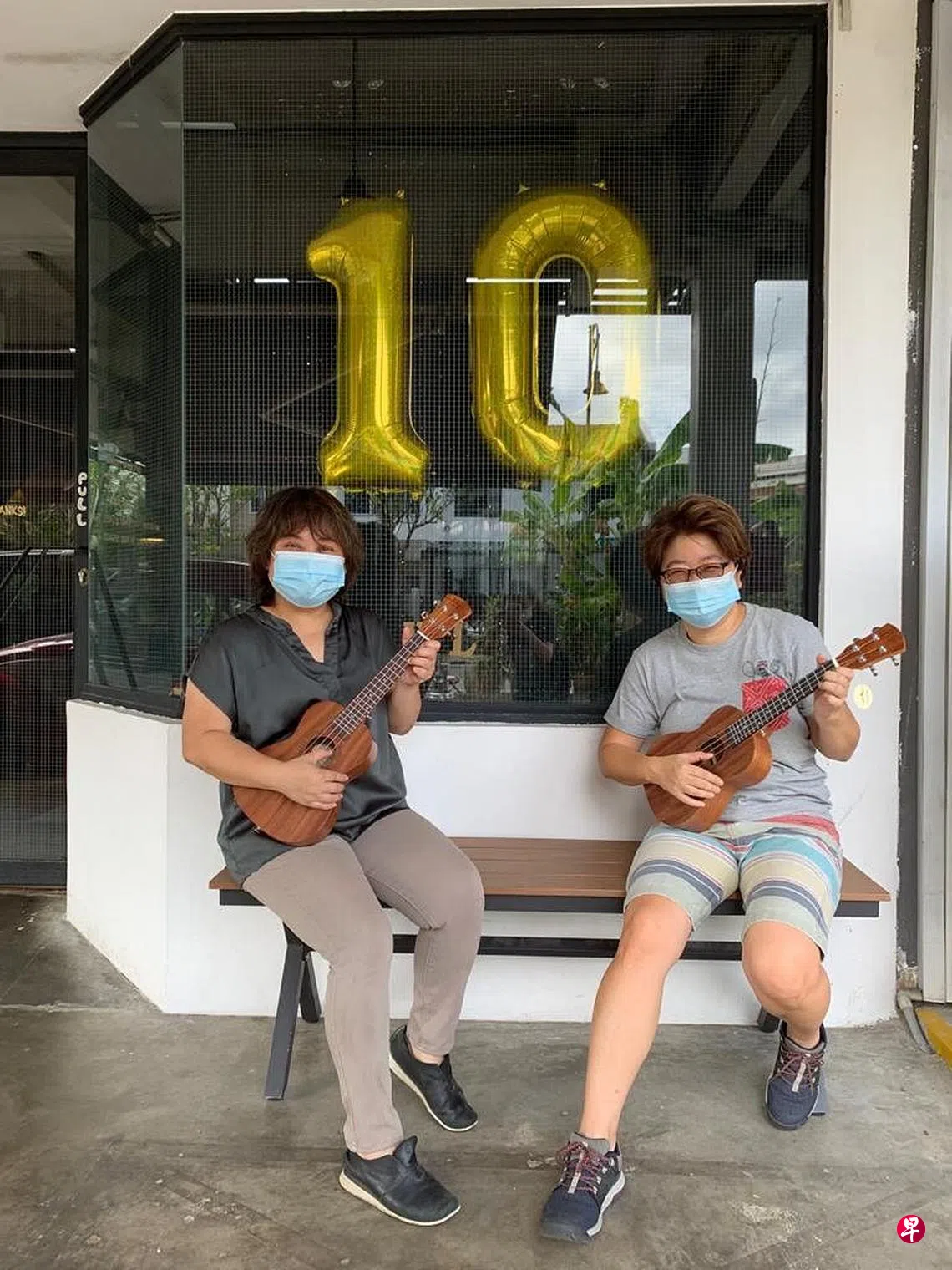 Wimbly Lu咖啡馆由林慧敏(50岁,左)和陈振兴(50岁,右)于2011年携手创办,至今已有10年历史,也从原来的一家咖啡馆发展到今日有另两家分店。作为咖啡馆成立10周年的礼物,每一名咖啡馆员工都获赠一把乌克丽丽(ukelele),并在9月20日与两名老板一起在线上学习弹奏歌曲。