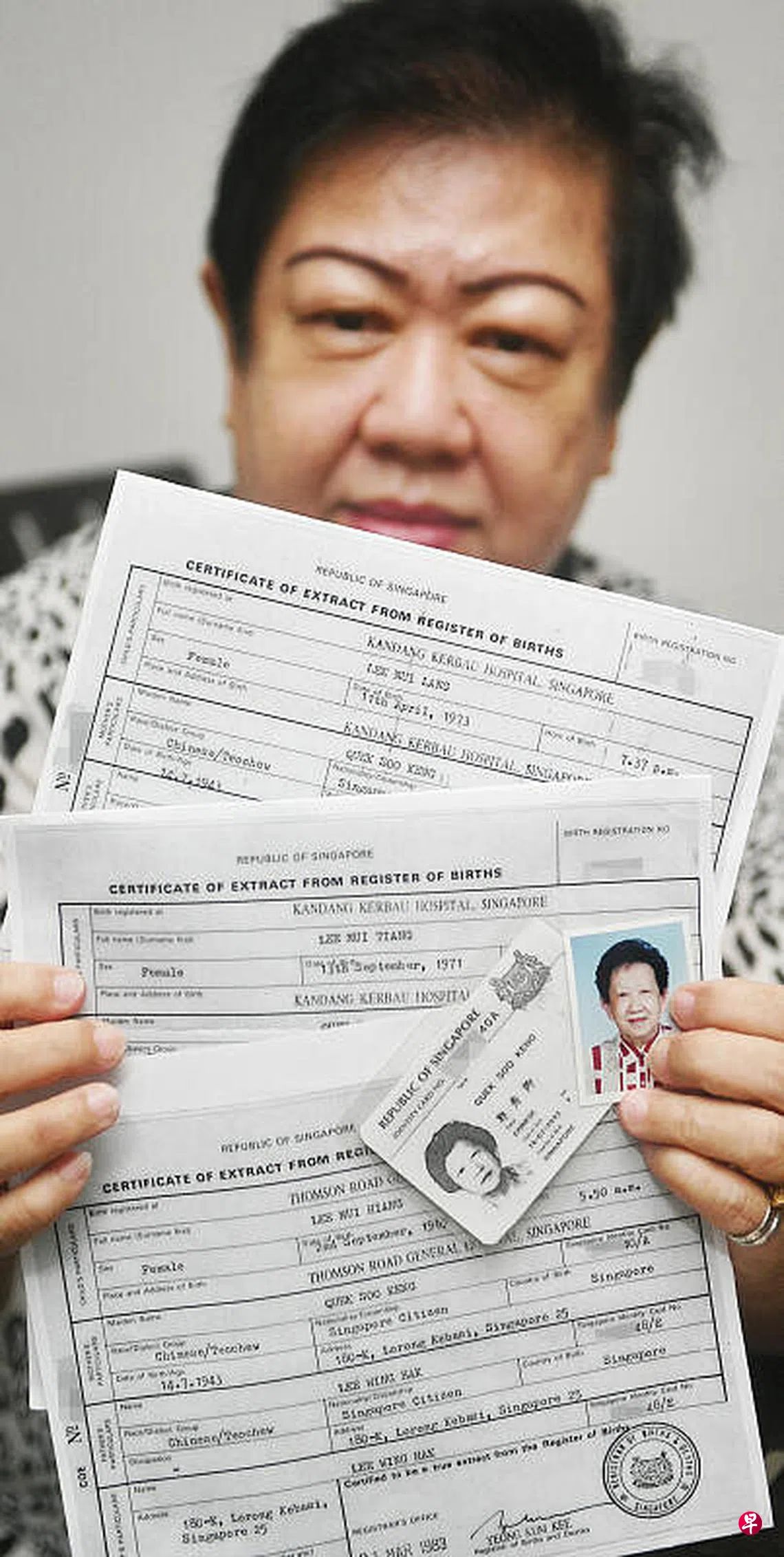 郭秀珠说,三名外甥女分别在1969、71及73年出生,名字是Lee Mui Hiang、Lee Mui Tiang及Lee Mui Lang,当年出生的地址则是在180-K,Lorong kebasi 11 1/2 m.s.,Singapore。