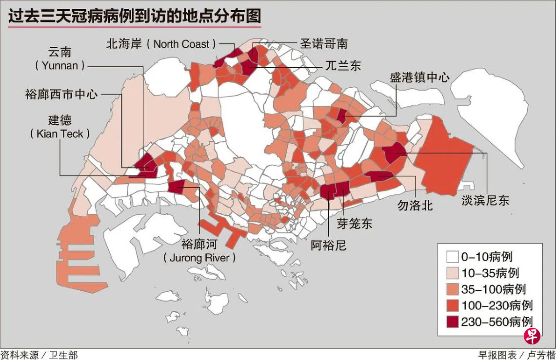 根据covidsitrep.moh.gov.sg网站,地图以红色的深浅代表病例到访人数多少,并把数目划分为五个范围。最少的零至10起病例用白色呈现,最多病例到访数目介于230至560起,为深红色地区。