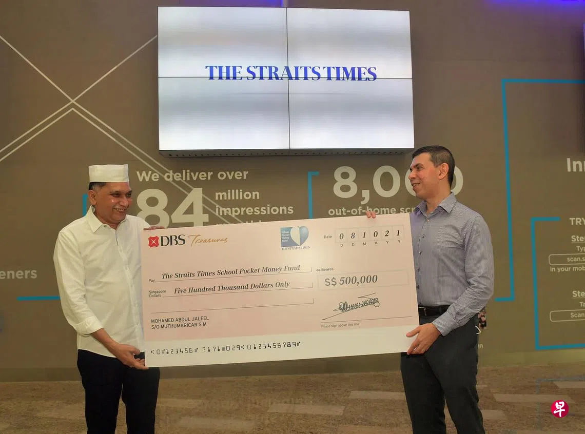 《海峡》学校零用钱基金会 今年料拨900万元助弱势学生订户赠阅文章阿都扎利尔(左)把50万元的支票交给《海峡时报》学校零用钱基金会主席华仁·费南德斯(右)。(海峡时报)卢慧恩 报道loohuien@sph.com.sg《海峡时报》学校零用钱基金会今年收到的申请比往年多,预计将拨款900万元为有需要的学生提供援助。这将是该基金会自2000年成立以来拨出的最高款项。新加坡报业控股低收入家庭学校零用钱基金援助上一篇国大杨潞龄医学院 设立以马凯硕命名教授席下一篇曾判监16年 贼性不改摊位助手 夜潜咖啡店偷烟 购买此文章