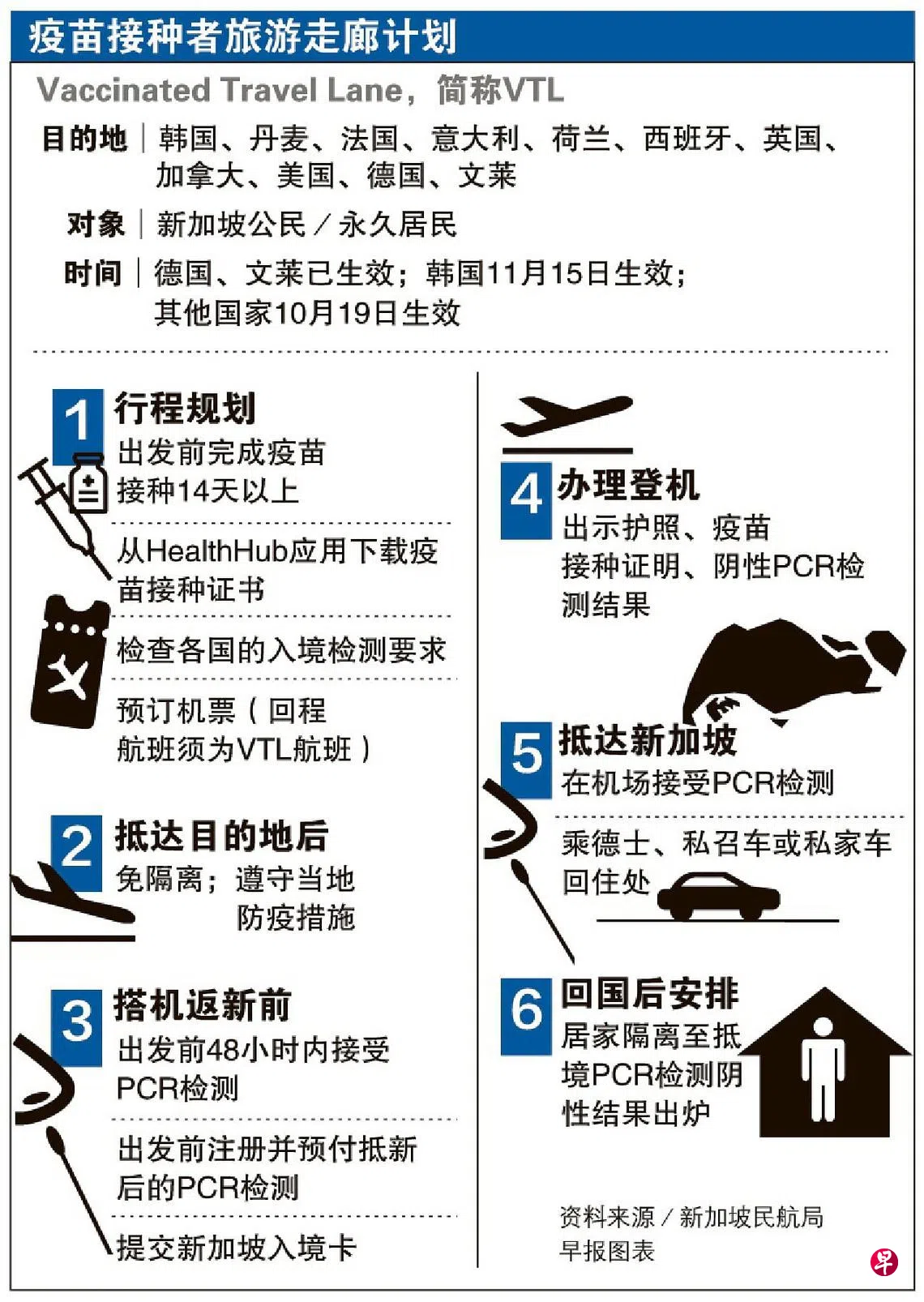 我国昨天(10月9日)宣布把疫苗接种者旅游走廊计划(简称VTL)扩大至加拿大、丹麦、法国、意大利、荷兰、西班牙、英国,以及美国。来自这八个欧美国家的旅客可从本月19日起通过VTL计划入境新加坡。