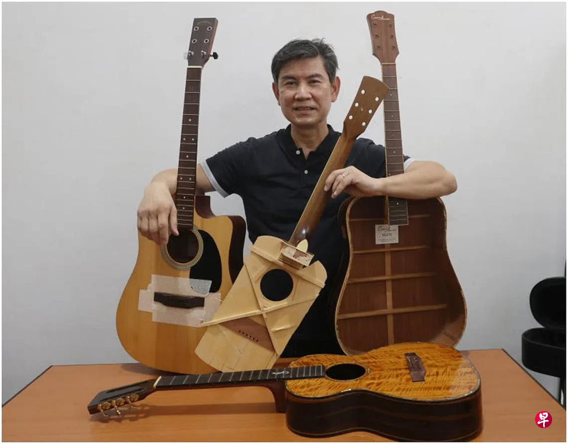 他买了一把失修吉他后,上YouTube观看视频,再向几个会修理吉他的朋友请教,就修好第一把吉他。