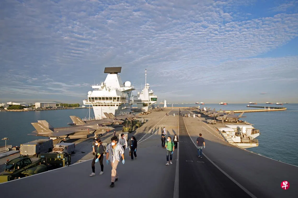 英国伊丽莎白女王号(HMS Queen Elizabeth)航空母舰打击群昨日停靠新加坡,航母群指挥官表示,航母群有意与新加坡海军继续深化合作。