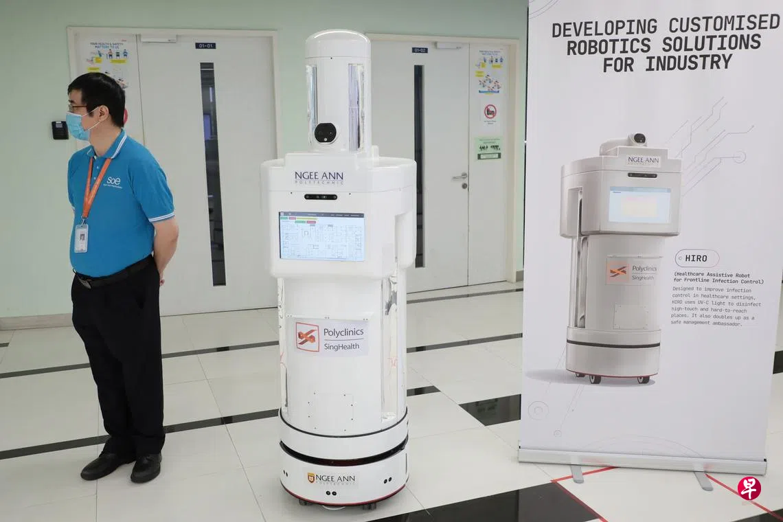 义安理工学院和新加坡保健服务集团综合诊疗所联合开发多功能机器人,可利用紫外线消毒,还能充当安全管理大使,提醒公众戴口罩及保持安全距离。