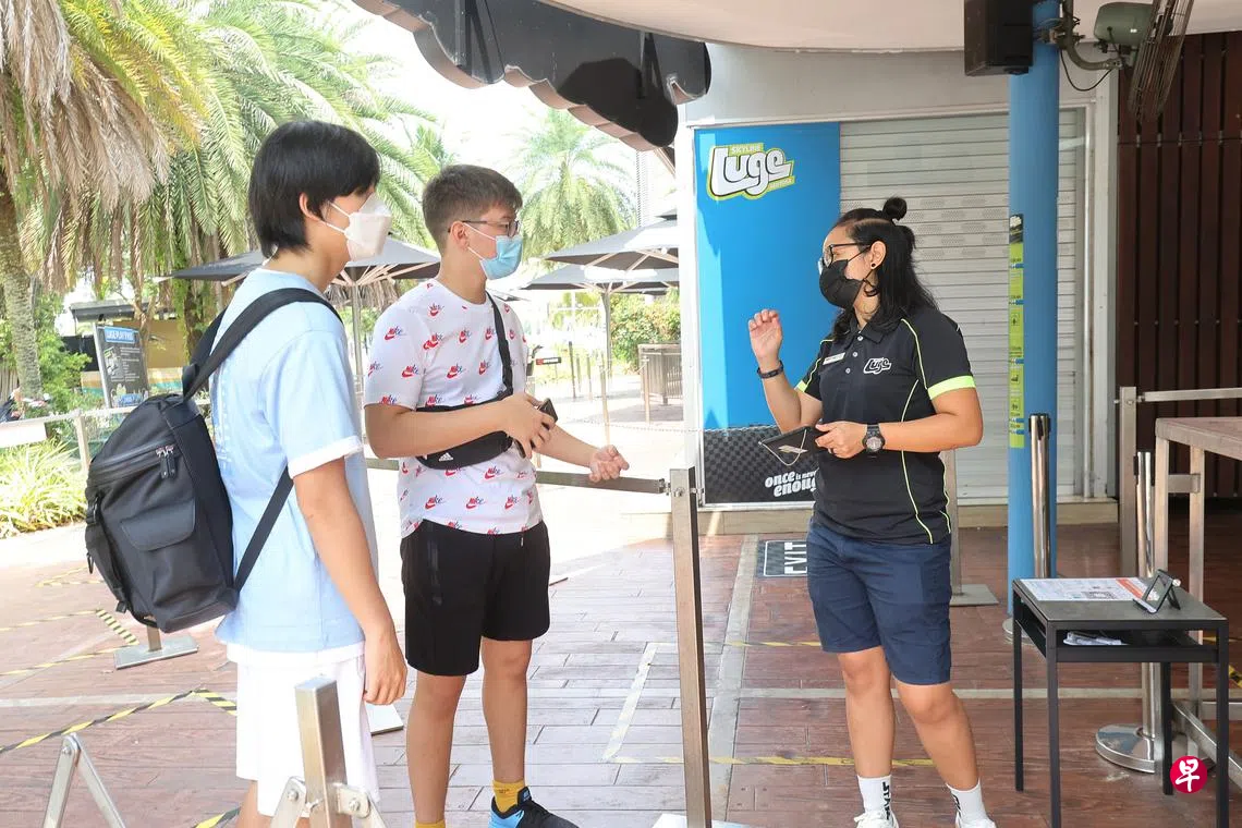14岁的耶鲁和三名同学昨早相约到圣淘沙游玩,却在圣淘沙斜坡滑车与空中吊椅(Skyline Luge)售票处门口被工作人员告知他和同学瑞安(14岁)未完成接种,不能进入景点,四人只好无奈离开。