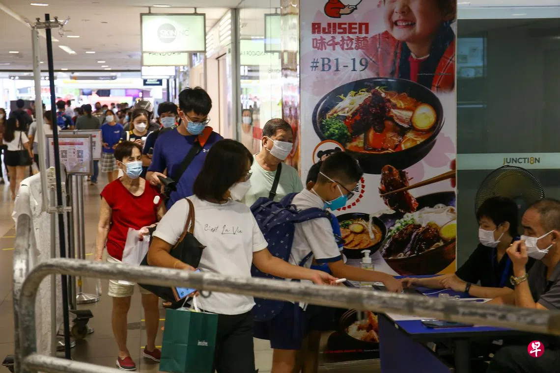 《联合早报》记者昨天走访几家商场时发现,商场都在入口处加派人手,确保检查公众的接种证明时,不会造成长长的人龙。其中,碧山第八站(Junction 8)中午时段出现排队情况,但公众等候几分钟便能进入商场。
