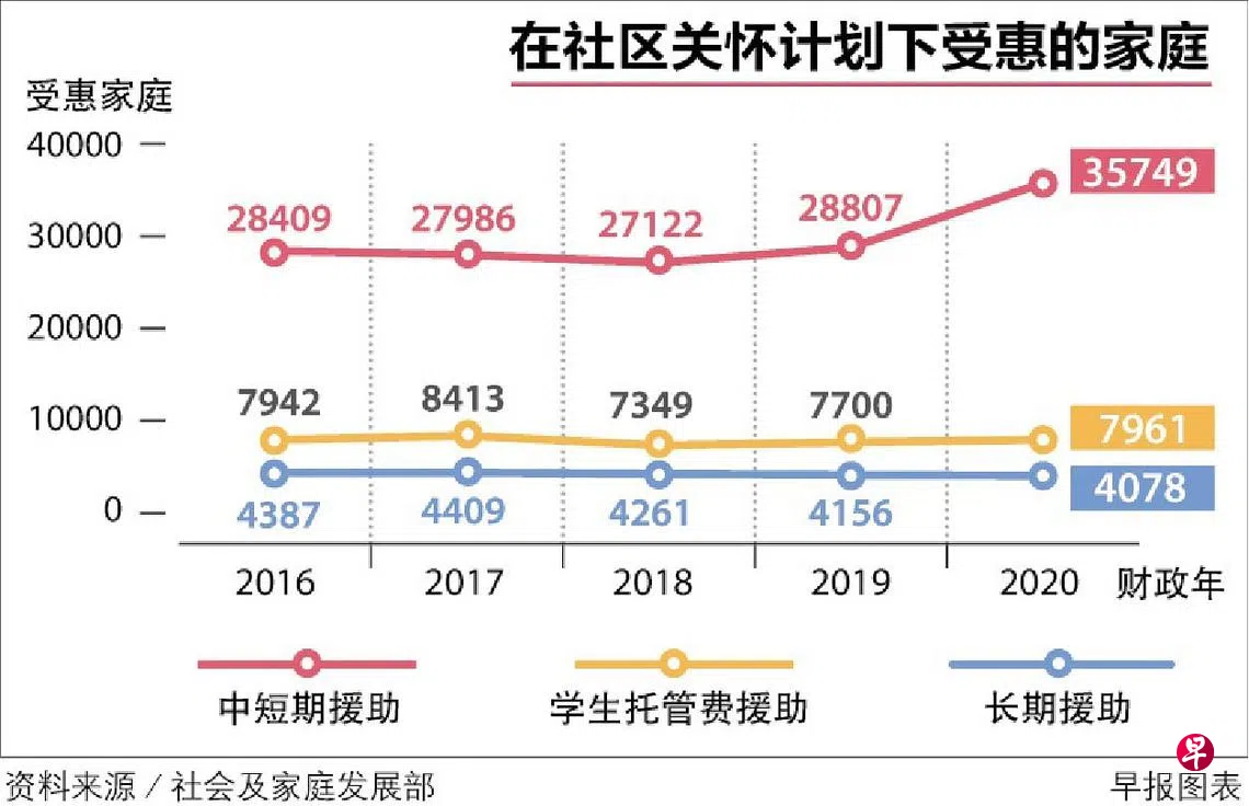 社会及家庭发展部发布社区关怀(ComCare)计划2020财政年数据时指出,相较前个财年,上个财年的受惠者增加了22%。这主要是因为在这期间领取中短期援助的家庭增加了24%,达3万5700户,援助金额也增加约77%,达1亿8300元。上个财年指的是去年4月至今年3月。