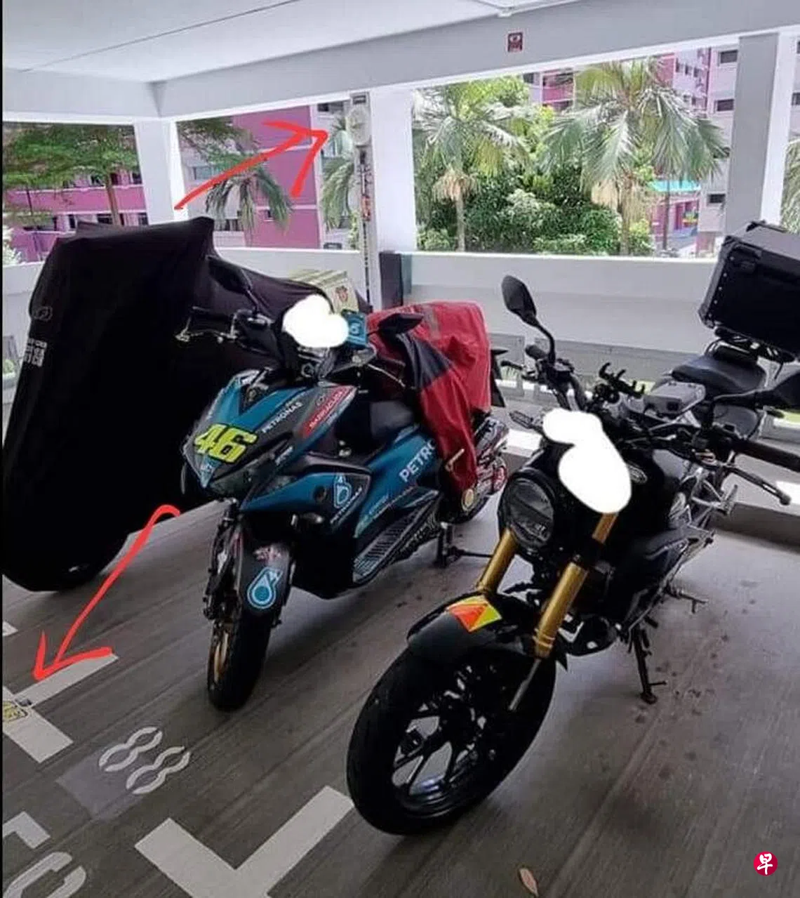 照片显示,89号车位有贴纸,相信就是用来标注车位属于留字条的骑士,而附近墙上也有贴纸,并挂上了时钟跟扫把。据了解,留字条的骑士相信有三辆电单车停放在停车场。