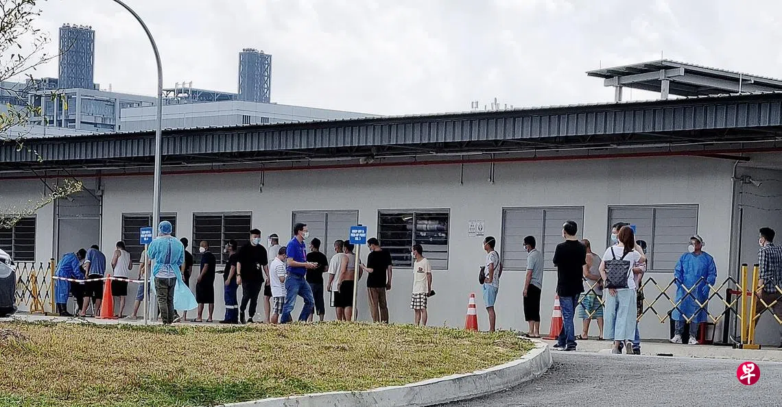 《联合早报》记者昨天走访该宿舍时,喧闹的场景不再,只有20多名客工井然有序地在宿舍大门排队,相信正等待受检。