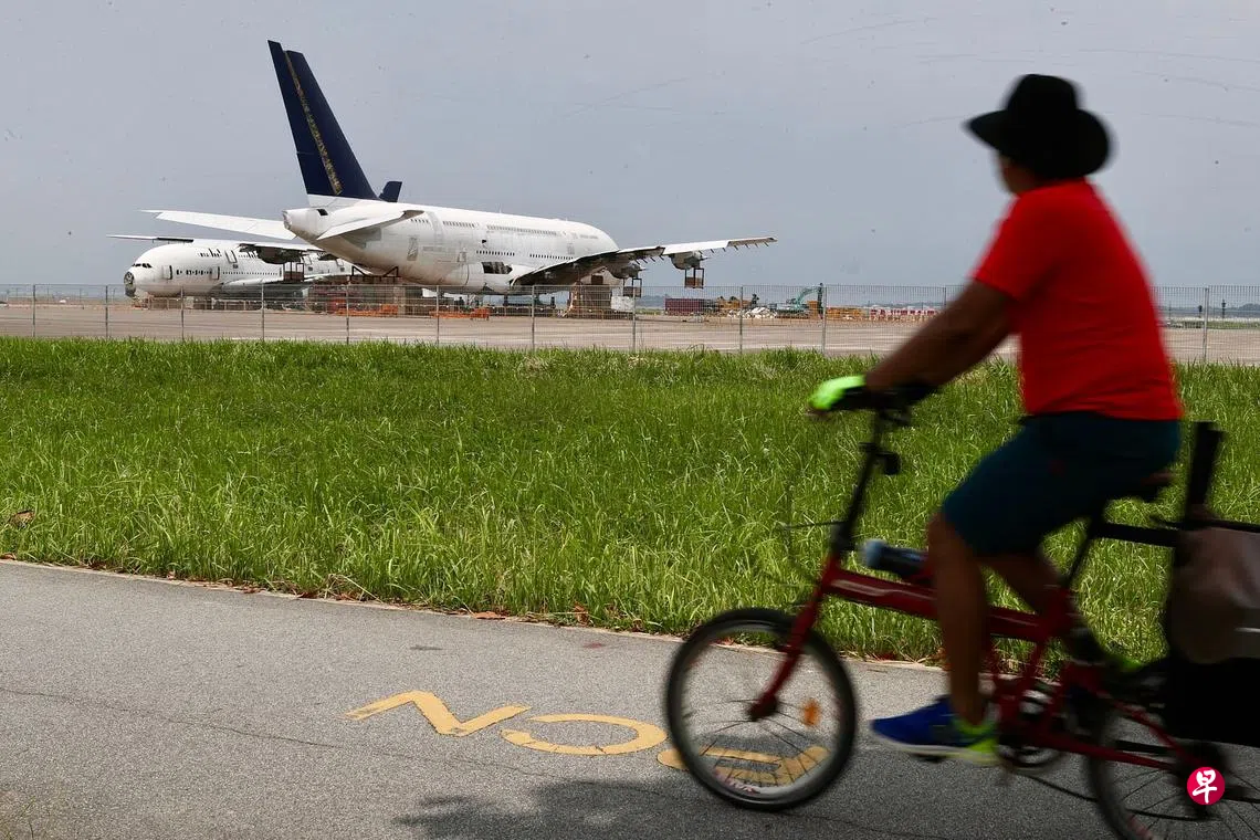 多年来翱翔云端、俗称空中“巨无霸”的A380客机退役后被拖到樟宜展览中心进行拆卸,形成地面上一道独特的风景。