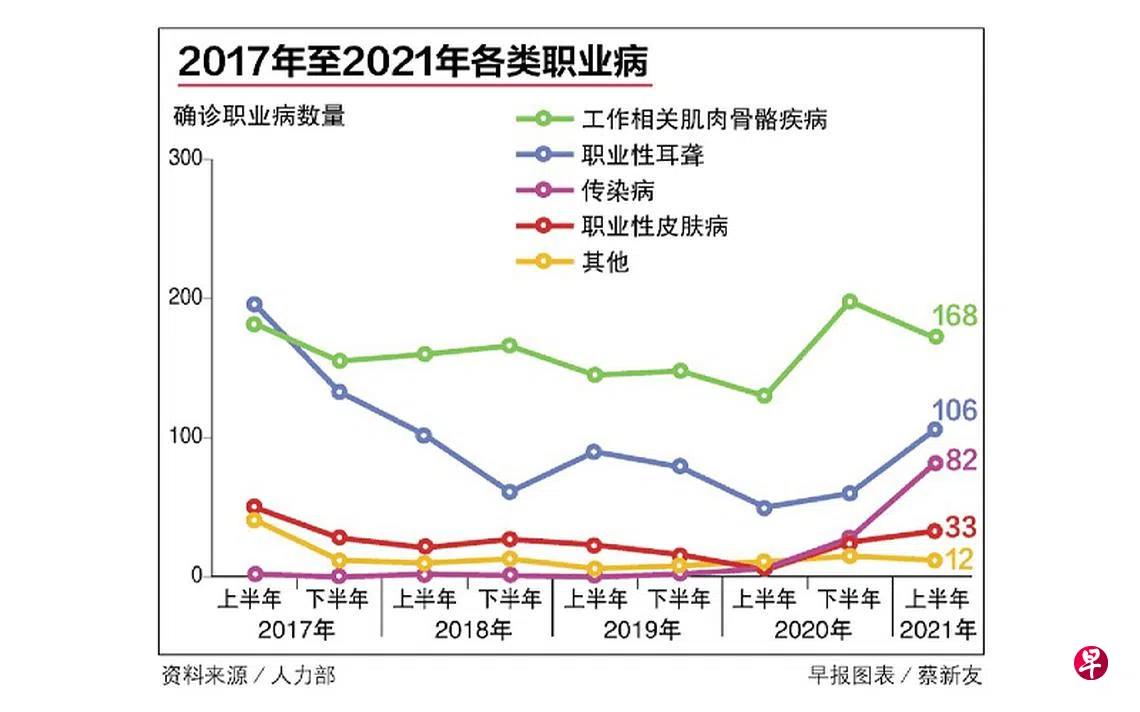 根据人力部和工作场所安全与卫生理事会日前联合发表的2021年上半年工作场所安全与卫生报告,今年上半年确诊的职业病从去年下半年的326起增至401起。职业病中,传染病共有82起,排第三,仅次于168起工作相关肌肉骨骼疾病,以及106起职业性耳聋。