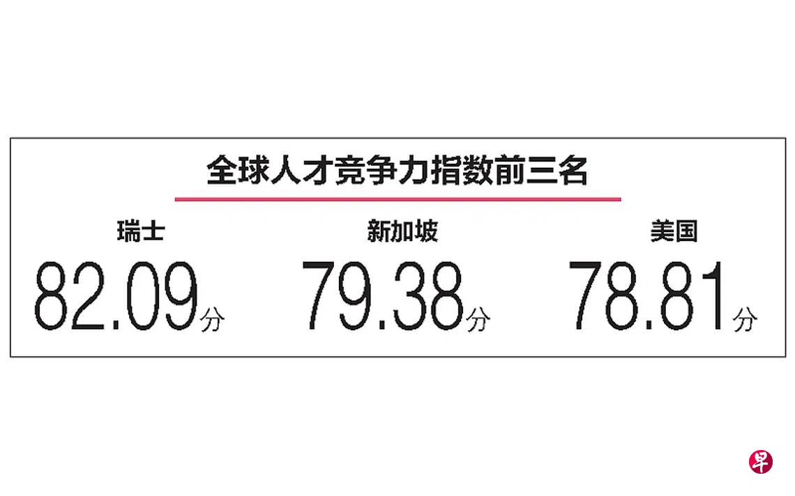 瑞士以82.09分继续高居全球人才竞争力榜首,新加坡(79.38分)和美国(78.81分)紧跟在后。自2013年展开调查以来,新加坡在全球榜上一直是坐亚望冠,唯独去年被美国拉下。