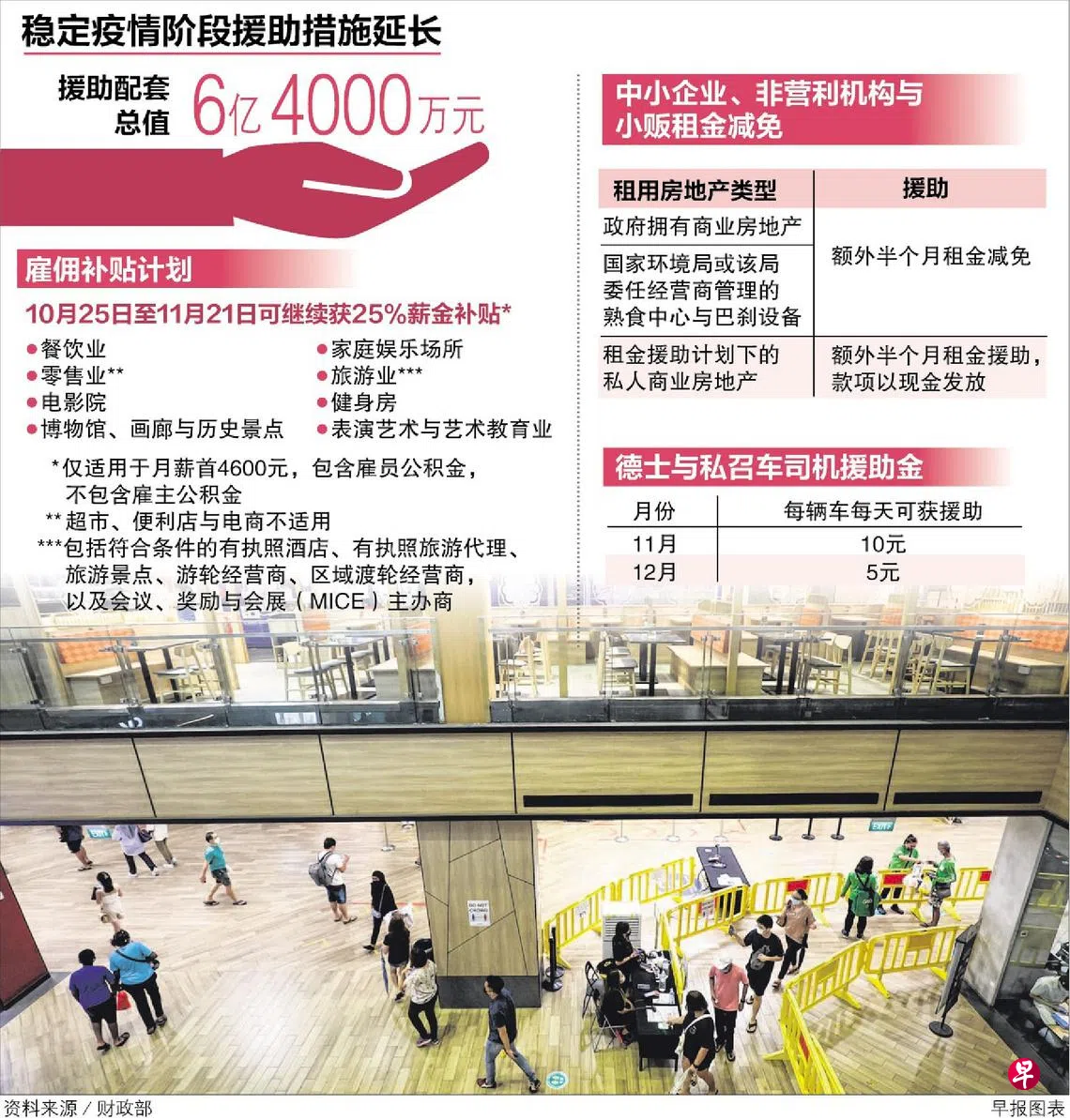 从10月25日至11月21日,餐饮业、表演艺术与艺术教育业、健身房、零售业、电影院、博物馆、美术馆、历史景点、家庭娱乐场所、旅游业,以及受影响的个人护理服务业,可在雇佣补贴计划下获得25%的薪金补贴。