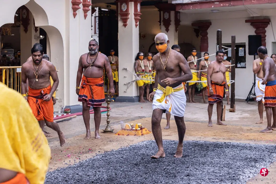马里安曼印度庙(Sri Mariamman)昨晚举行蹈火节,受疫情影响,只有完成冠病疫苗接种或检测呈阴者才能参与蹈火仪式。