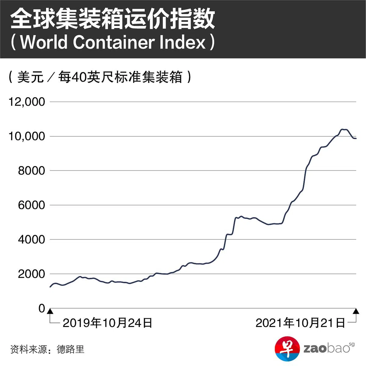 美国港口拥挤,直接导致了中国至美国航线集装箱成本大幅增加。根据国际航运研究公司德路里(Drewry)的数据,中美航线单个40英尺集装箱运价,从2019年的平均不到2000美元,涨至目前的超1万美元,涨幅近1000%。