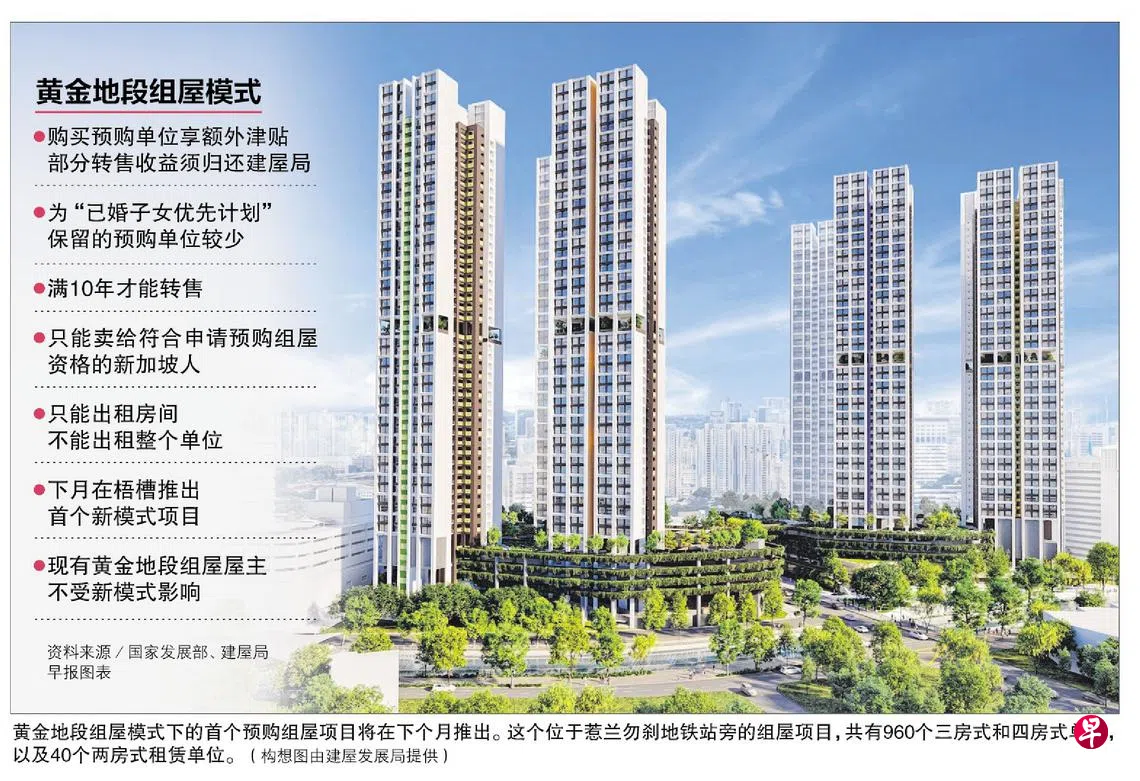 下个月在惹兰勿刹地铁站旁推出的梧槽预购组屋项目,将率先实行新的黄金地段组屋模式。新加坡人购买这类预购组屋时享有额外津贴,但须住满10年才能转售,并将部分转售收益归还建屋发展局。