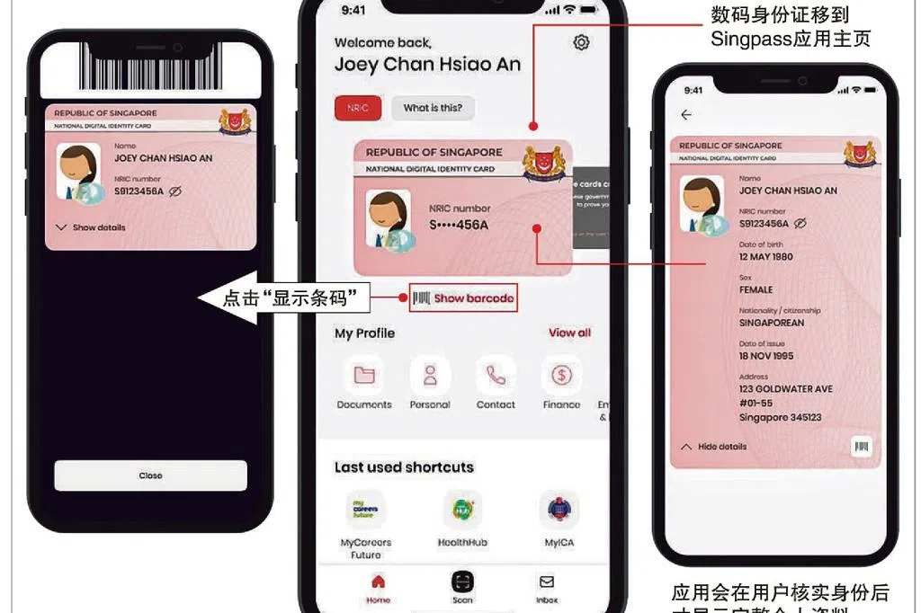 此外,Singpass只会显示身份证号码最后四个字母,用户须输入密码或扫描脸部或指纹,才会显示完整的号码、姓名和住址等资料。