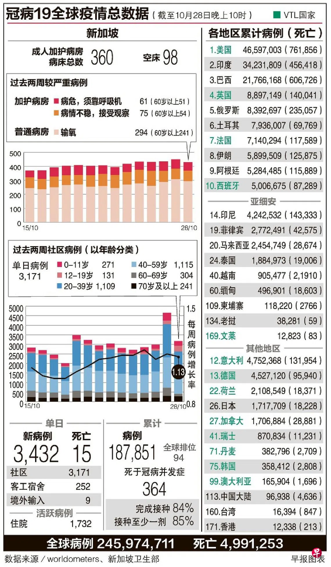 较前天大幅回落 本地新增3432病例15人死订户赠阅文章昨天的新增病例中,3171起来自社区,252起属于客工宿舍,九起从境外输入。目前全国加护病房的空置床位达98个,床位使用率达72.8%。陈劲禾 报道jinhet@sph.com.sg冠状病毒19变种毒株上一篇下月起政府机构服务 接受以Singpass应用验证身份下一篇F1维修站大楼改为收治冠病病患设施购买此文章