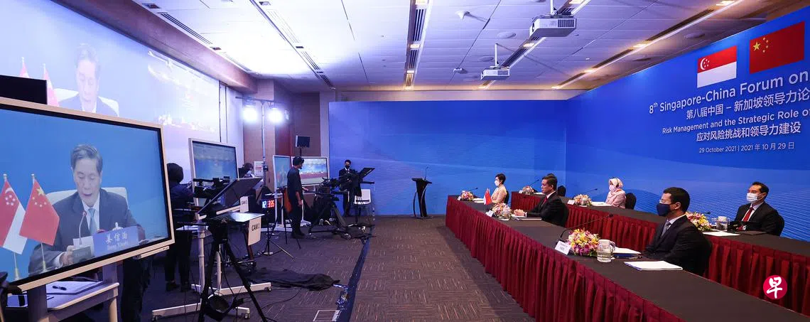 贯彻重要价值观推进国家治理 陈振声:政治领导人须取信于民订户赠阅文章第八届新加坡—中国领导力论坛昨天在线上举行,由主管公共服务的教育部长陈振声(前排中)和中共中央组织部常务副部长姜信治(屏幕)联合主持。我国代表团包括通讯及新闻部长兼内政部第二部长杨莉明(前排左)、负责社会服务整合事务的国家发展部长李智陞(前排右)、国家发展部兼通讯及新闻部政务部长陈杰豪(后排右),以及卫生部兼通讯及新闻部政务次长拉哈尤(后排左)。(李健玮摄)陈振声昨天在第八届新加坡—中国领导力论坛发表主旨演讲时说,唯才是用和廉洁正直是我国甄选政治领导人时注重的价值观,这些价值观在他们的领导旅程中也不断得到加强。杨浚鑫 报道yeoch@sph.com.sg新中关系陈振声上一篇国会后天复会 卫生部高级政务部长就医院床位现状发表部长声明下一篇疫情限制海外留学 六所大学今年扩招约1000名本地学生购买此文章