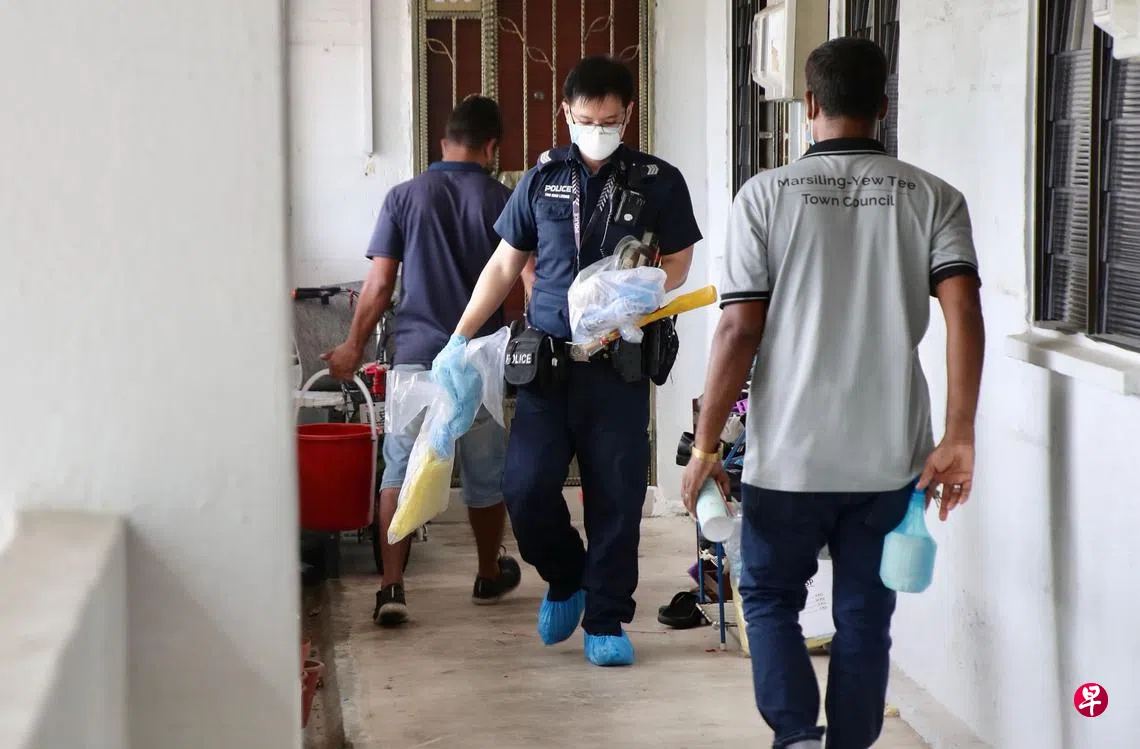腐臭味飘散蛆虫爬出 邻居报警揭男子死于屋内订户赠阅文章警员到场后多次敲门,但无人回应,于是请来开锁匠。图为警员事后从事发单位取走部分证物。马西岭—油池市镇理事会也派清洁工清洗走廊。(陈来福摄)涂健强 报道thorkk@sph.com.sg马西岭一个组屋单位过去一周传出阵阵腐臭味,居民以为是楼下垃圾或死老鼠发出的异味,直到昨早(10月29日)惊见蛆虫从屋内爬出才察觉不妙。警方接到通知后上门调查,发现一名年轻男住户已死亡多时成了腐尸。马西岭上一篇倒车撞交警男子涉无照驾驶及诈骗 汽车乘客和租车男子也落网下一篇男婴被哄抱入睡后死亡 验尸庭裁定为悬案购买此文章