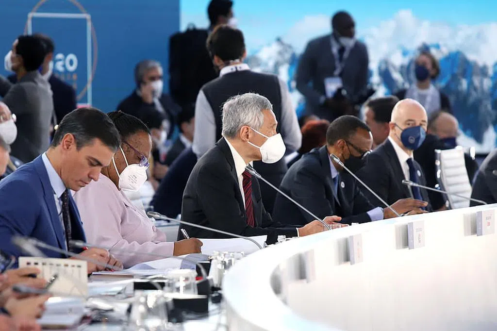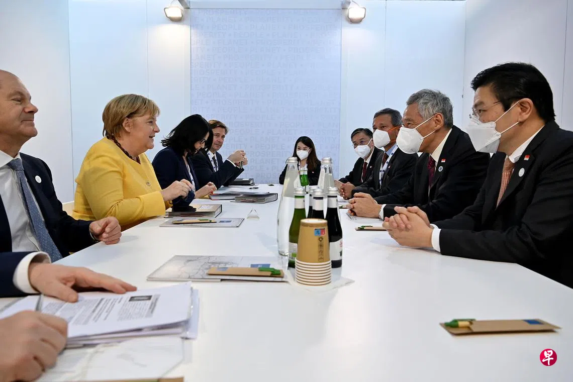 在意大利罗马出席二十国集团(G20)领导人峰会的李显龙总理(右二)昨天在峰会场边与领导德国看守政府的默克尔(左二)等国家领导人会面。