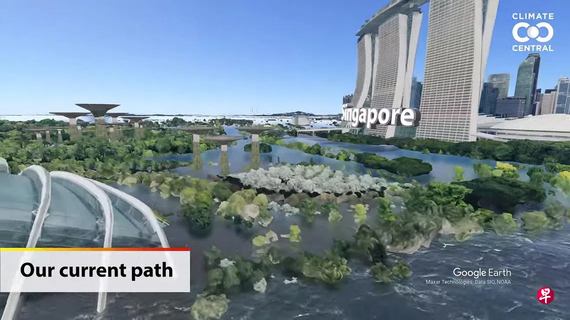 气候中心以研究为基础所制作的互动地图显示,气温若上升3摄氏度,新加坡除了滨海湾花园等沿海地区,芽笼、文庆和裕廊西多处的陆地也将在数百年后被淹。若上升幅度控制在1.5摄氏度,这些地区仅会有小部分区域淹水。