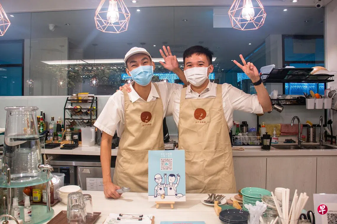 白色衬衣套上米色围裙,26岁的黄轩毅(图左)在柜台后舀了一个个冰淇淋球,将它们放在松饼上,眼带笑意地给顾客品尝。