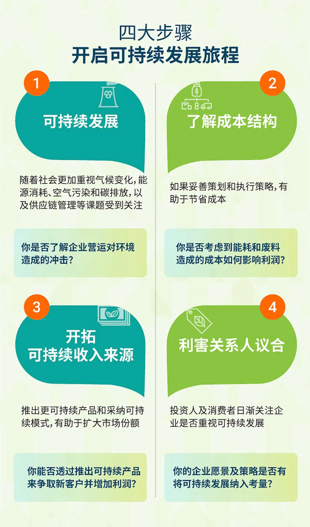 从上述可见,中小企业可利用多方面资源,开启可持续发展旅程并不难。追求可持续发展已成为不可忽视的大趋势,中小企业应抓紧时机,开创新商机。