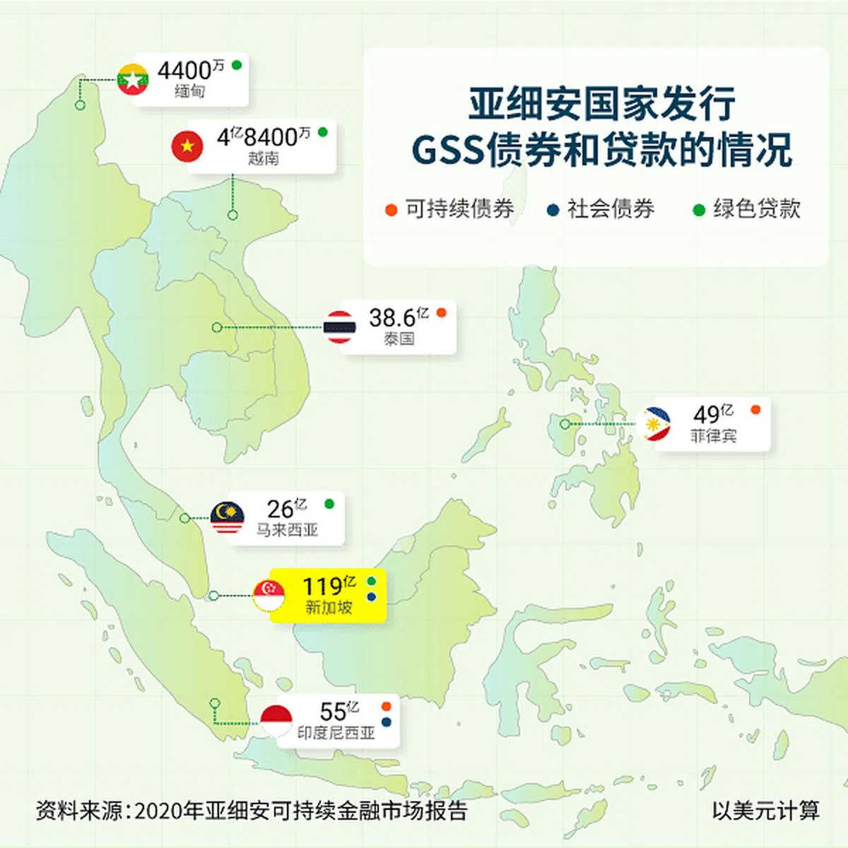 放眼亚细安,这个区域发行的绿色、社会与可持续(Green、Social and Sustainability,简称GSS)债券和贷款额在去年达到高峰,总数为128亿美元(约172亿新元),高于前年的115亿美元。其中,新加坡发行最多这类债券和贷款,多达119亿美元,占比超过90%。