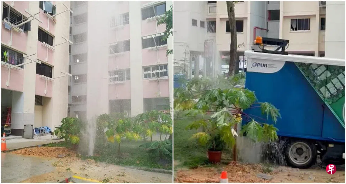 《联合晚报》读者林仁钦昨天(1日)下午1时20分经过义顺22街第263座组屋时,惊见水管爆裂喷高至四五层楼,拍照与视频,第一时间传给本报。