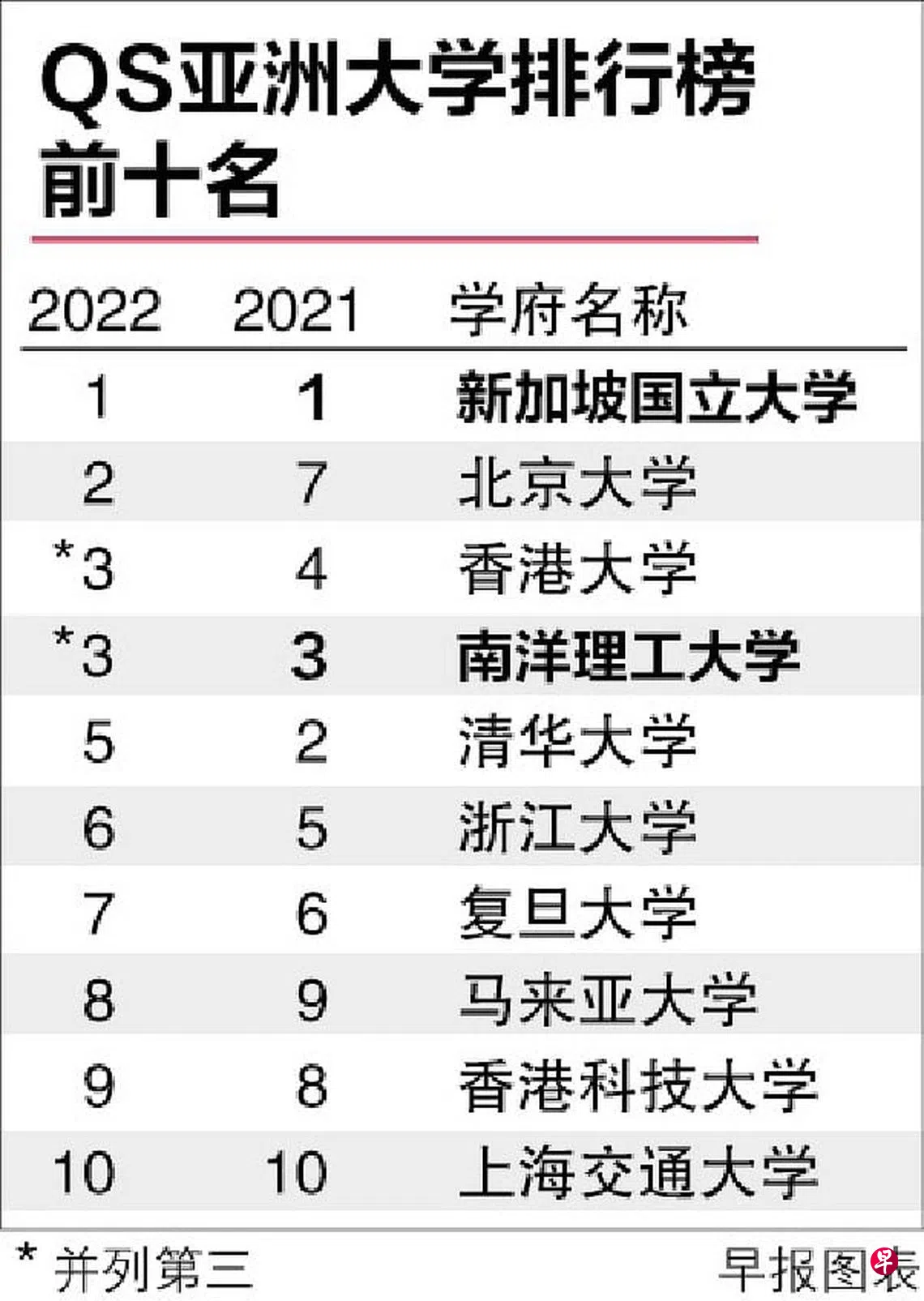 根据一项亚洲大学排名,新加坡国立大学蝉联第一,南洋理工大学排名保持不变,与晋升一个名次的香港大学并列第三。
