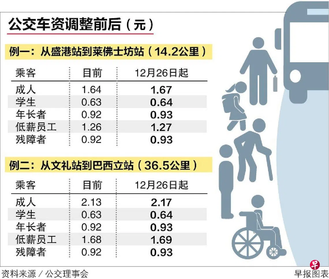 公共交通理事会昨天宣布从12月26日起上调车资。其中,以卡付费的成人车资每趟上调3分至4分。