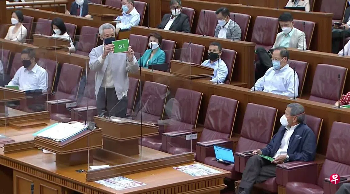 议员全数支持通过两项法案,其中宪法(修正)法案获在场的75名人民行动党和10名工人党议员投票通过。