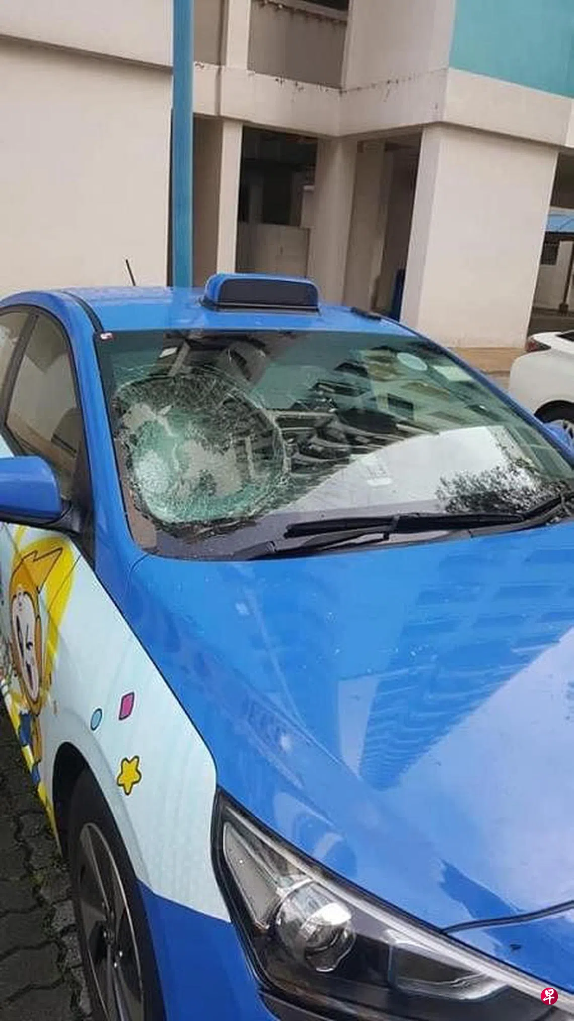 组屋楼下两停车位成“黑区”,德士叔疑找不到车位被迫停在该处,结果天降横祸,挡风镜被砸碎。