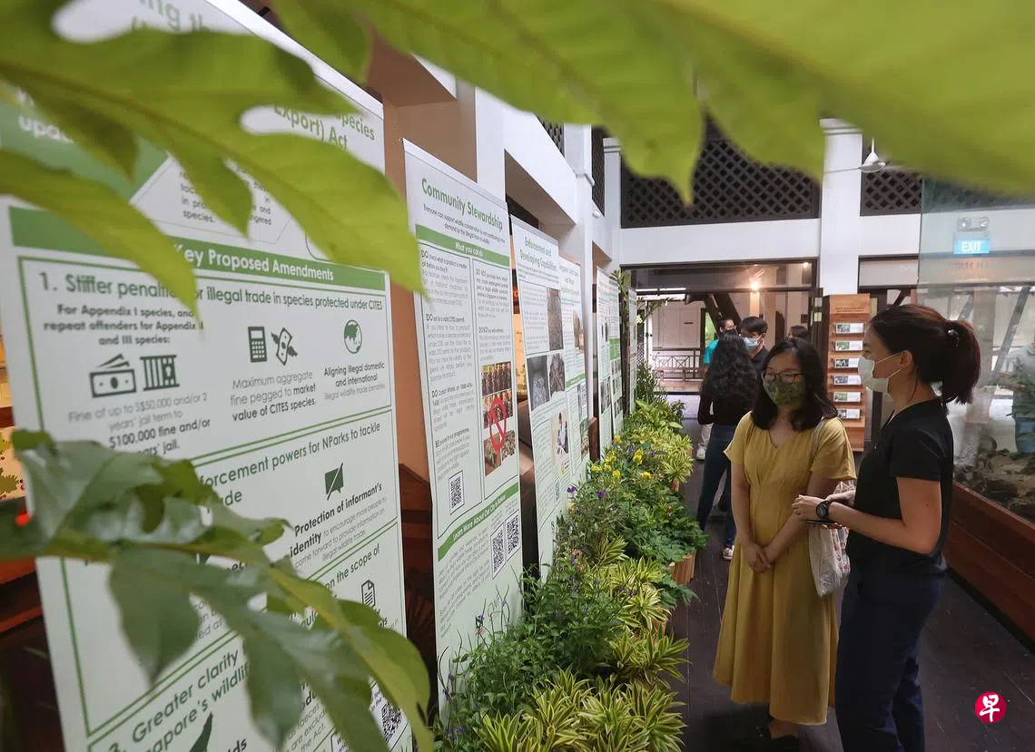 修法遏制非法交易濒危动植物订户赠阅文章有关修改濒危物种(进口与出口)法令的展览从即日起在武吉知马自然保护区等公园轮流展出。(唐家鸿摄)卢凌之 报道lulz@sph.com.sg为加大力度打击非法濒危野生动植物交易,政府拟议修改濒危物种(进口与出口)法令,加倍提高刑罚金额和刑期,并给予国家公园局更多执法权力。野生动物走私国家公园局上一篇回应马国要求不处决毒品走私犯 李总理:案件经过完整法律程序下一篇新日将开发系统监督温室气体排放 供亚细安工业设施使用购买此文章