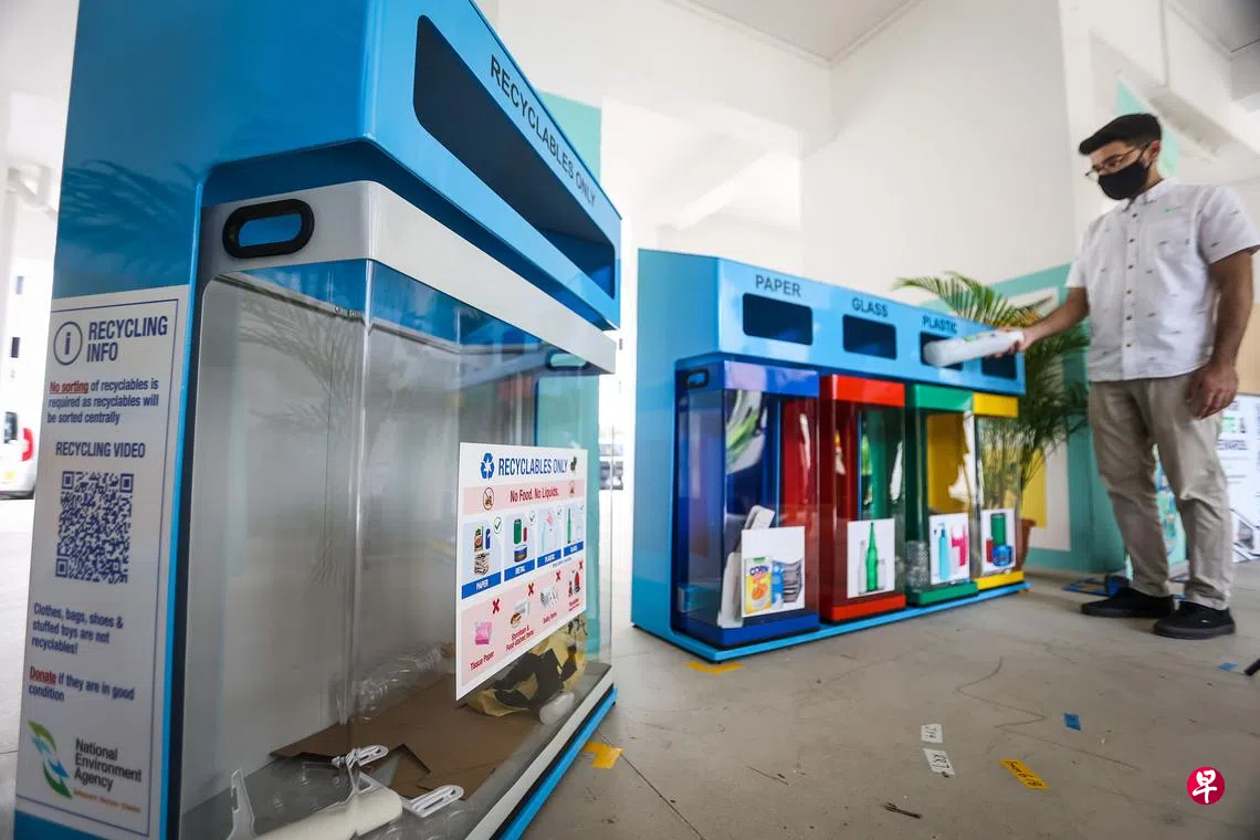 本地每10户家庭就有六户定期再循环垃圾,但丢入蓝色回收箱的物品有约四成是无法回收的,甚至还有未清洗过的物品,导致其他可回收物品也被污染。为此,永续发展与环境部和国家环境局在组屋区试用新设计的透明回收箱,让公众清楚看见箱内物品,了解如何进行正确回收。