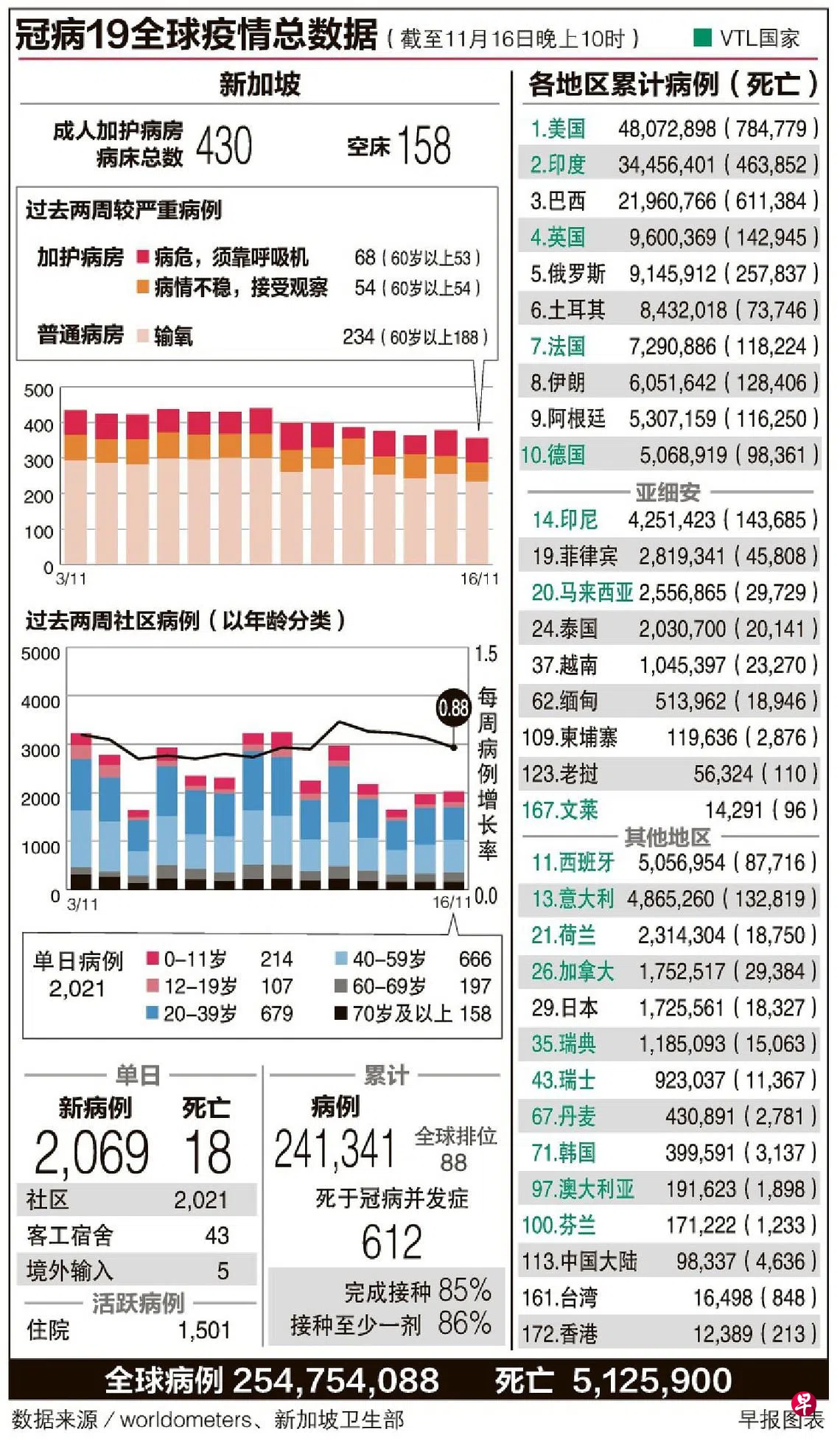 昨天出院的病患有2361名,其中363人是60岁及以上的年长者。过去七天,病危住在加护病房的冠病病患,已完成接种者是每10万人有0.6人,未完成接种者是5.4人。同期已完成接种的逝世冠病病患,每10万人仅0.1人,未完成接种者是1.0人。