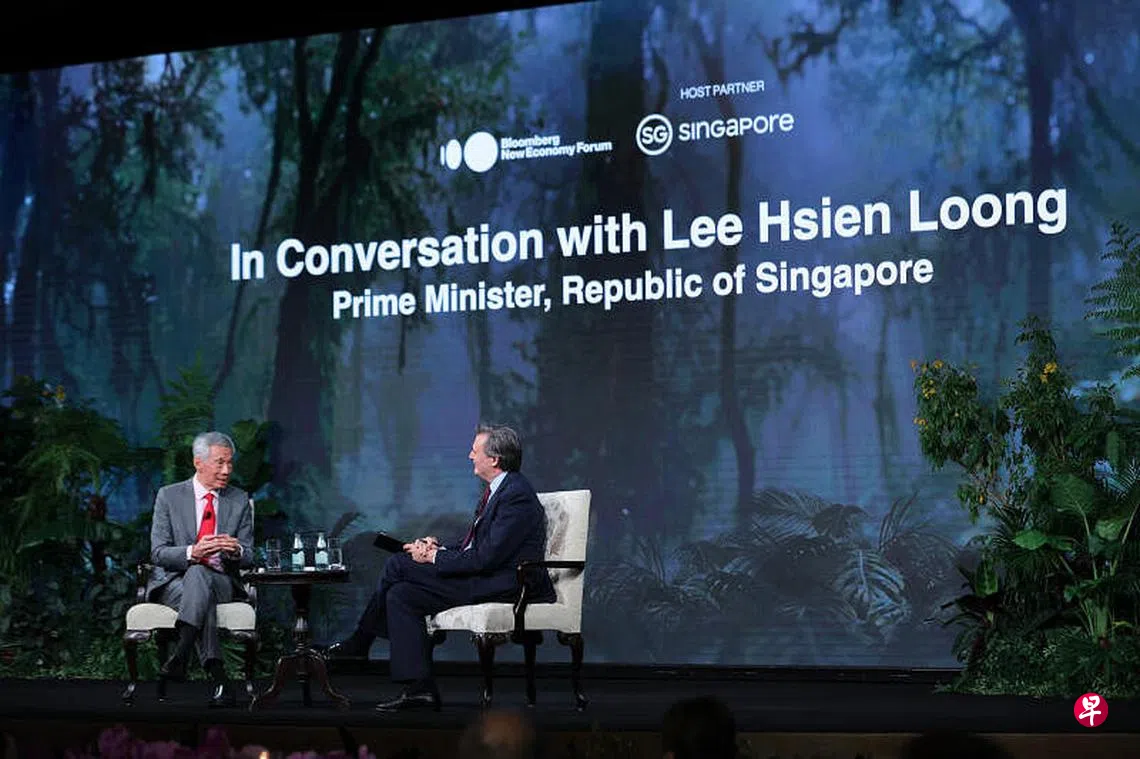 李显龙总理昨晚在彭博创新经济论坛(Bloomberg New Economy Forum)的晚宴上,接受彭博社总编辑米思伟(John Micklethwait)访问。