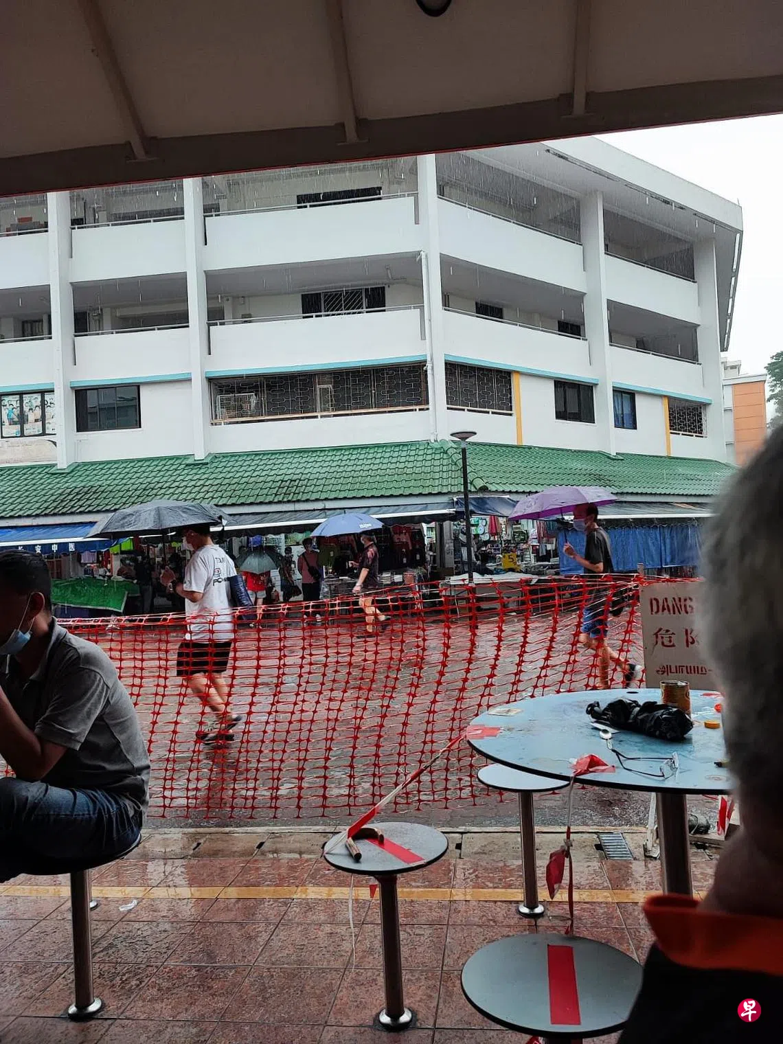 巴刹和小贩中心就在毗邻紧挨着,却因疫情管控措施被封锁线隔开犹如“楚河汉界”,要从巴刹走到小贩中心进出口得绕一圈,全程没遮盖。昨天早上一场大雨,让没带伞的人只好挤在巴刹出入口等雨停,有年长者则无奈冒雨走到小贩中心,引来许多人不满。